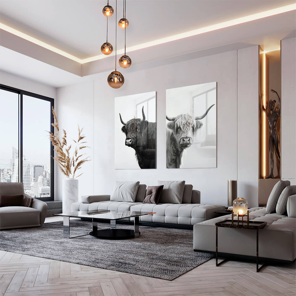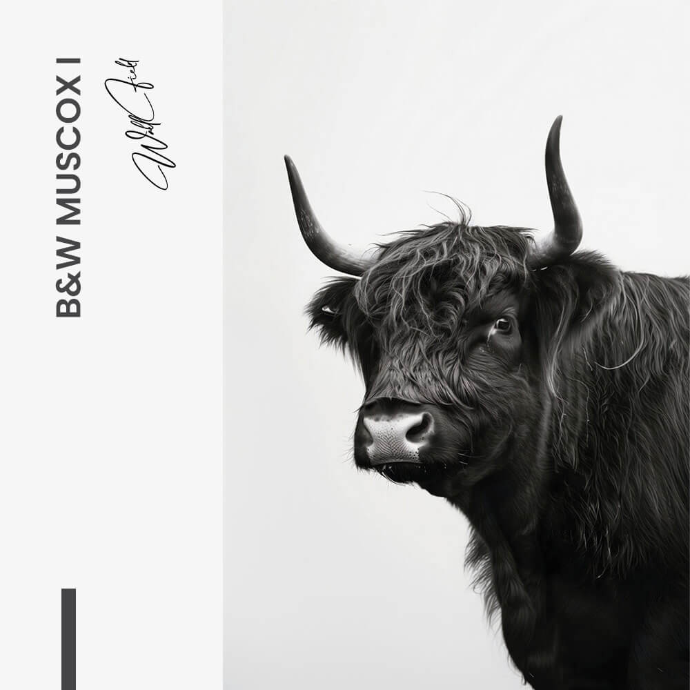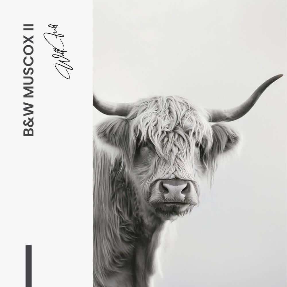 Kontrastens kraft kommer till liv i "Bundle B&W Muskox". Den mjuka strukturen och grova detaljerna skapar en harmonisk balans. En imponerande duo som utstrålar styrka och lugn.