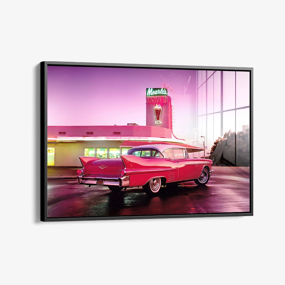 En rosa Cadillac lyser under neon på Mearles Drive-In i skymningen. De höga fenorna och krom fångar den sista luften som sockervadd. Våt asfalt reflekterar fönster, bokstäver och milkshakeljus. Ett stillastående vykortsögonblick från 1950-talet, redo för en sen natttur.