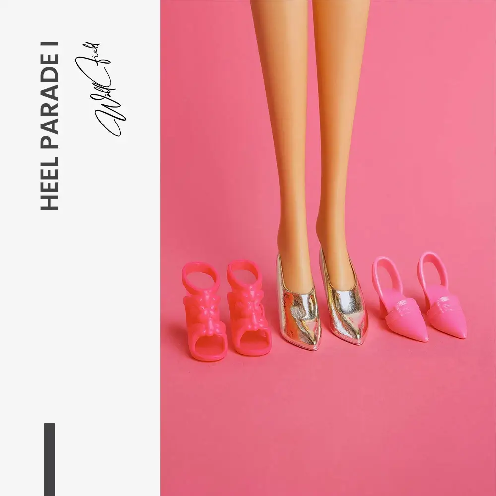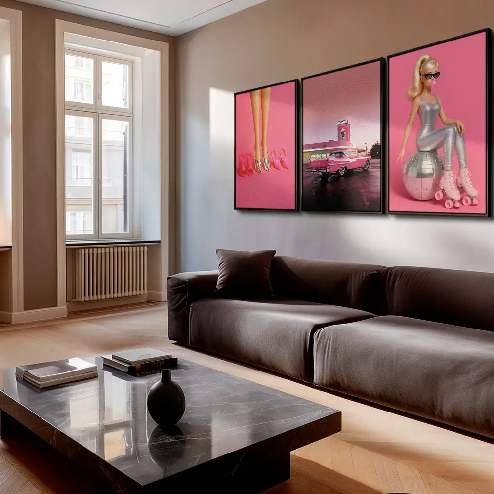 Den här trion tar en rosa väg: Barbies ben och klackar, en klassisk drive-in-scen och en discopose. Mittpanelen förankrar setet med retrobil och kvällsglöd. De yttre panelerna återför mode och lekfullhet till Barbie. Tillsammans är det en tajt blandning av stil, street och popnostalgi.