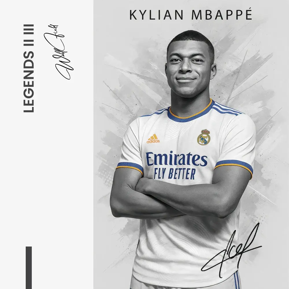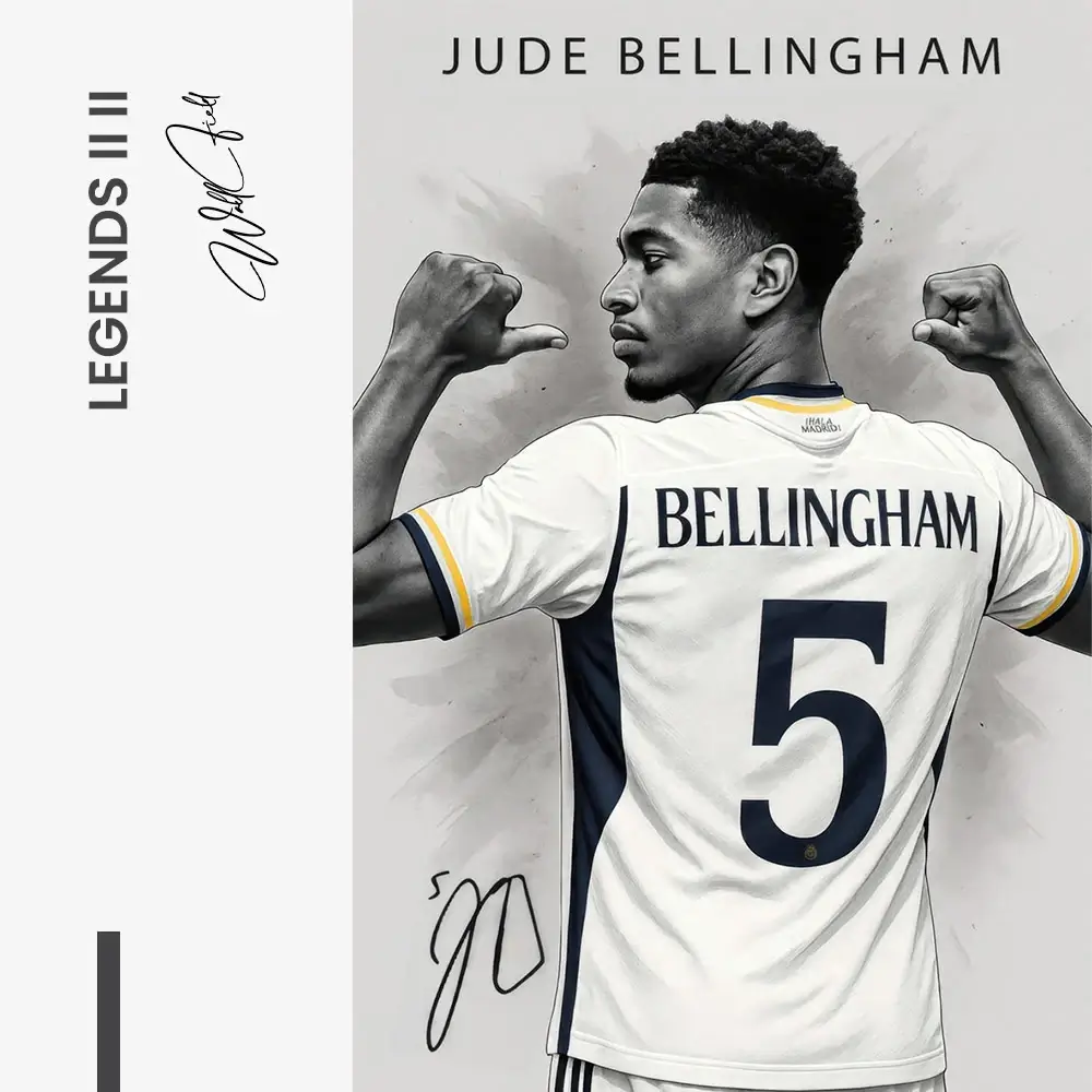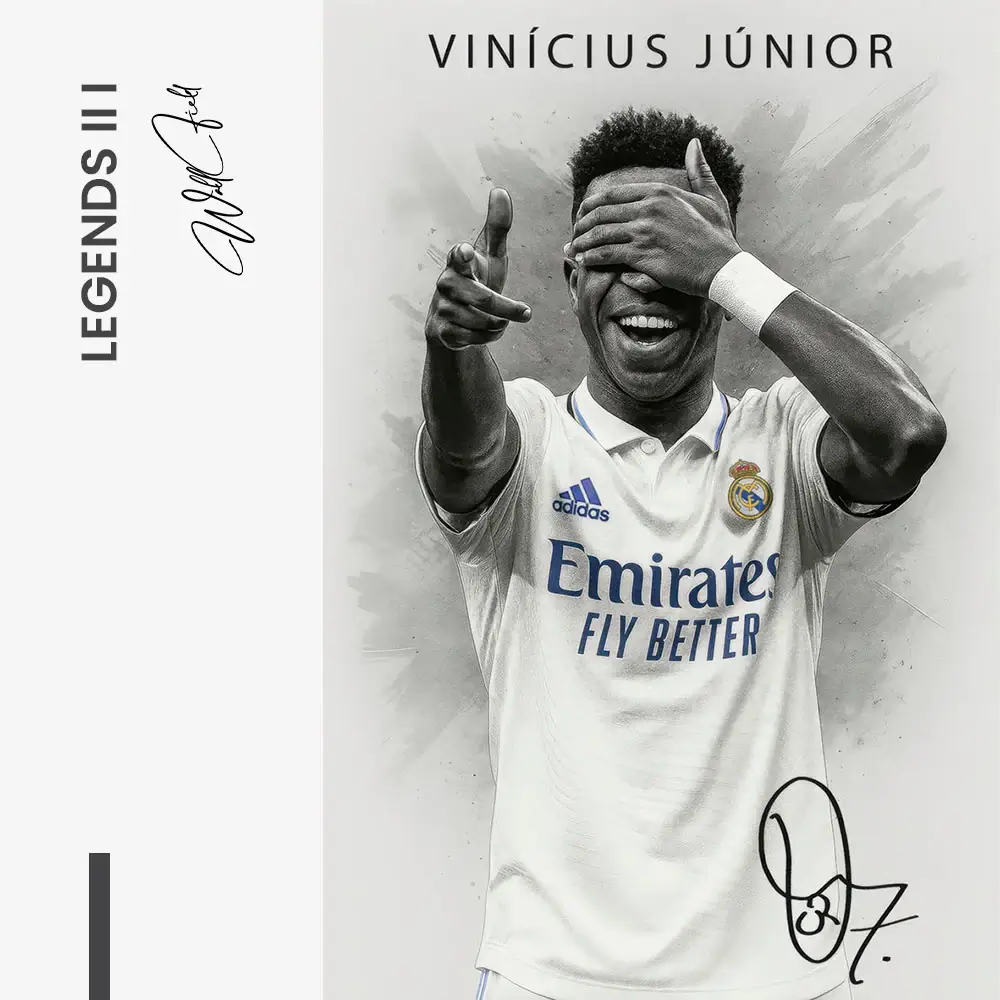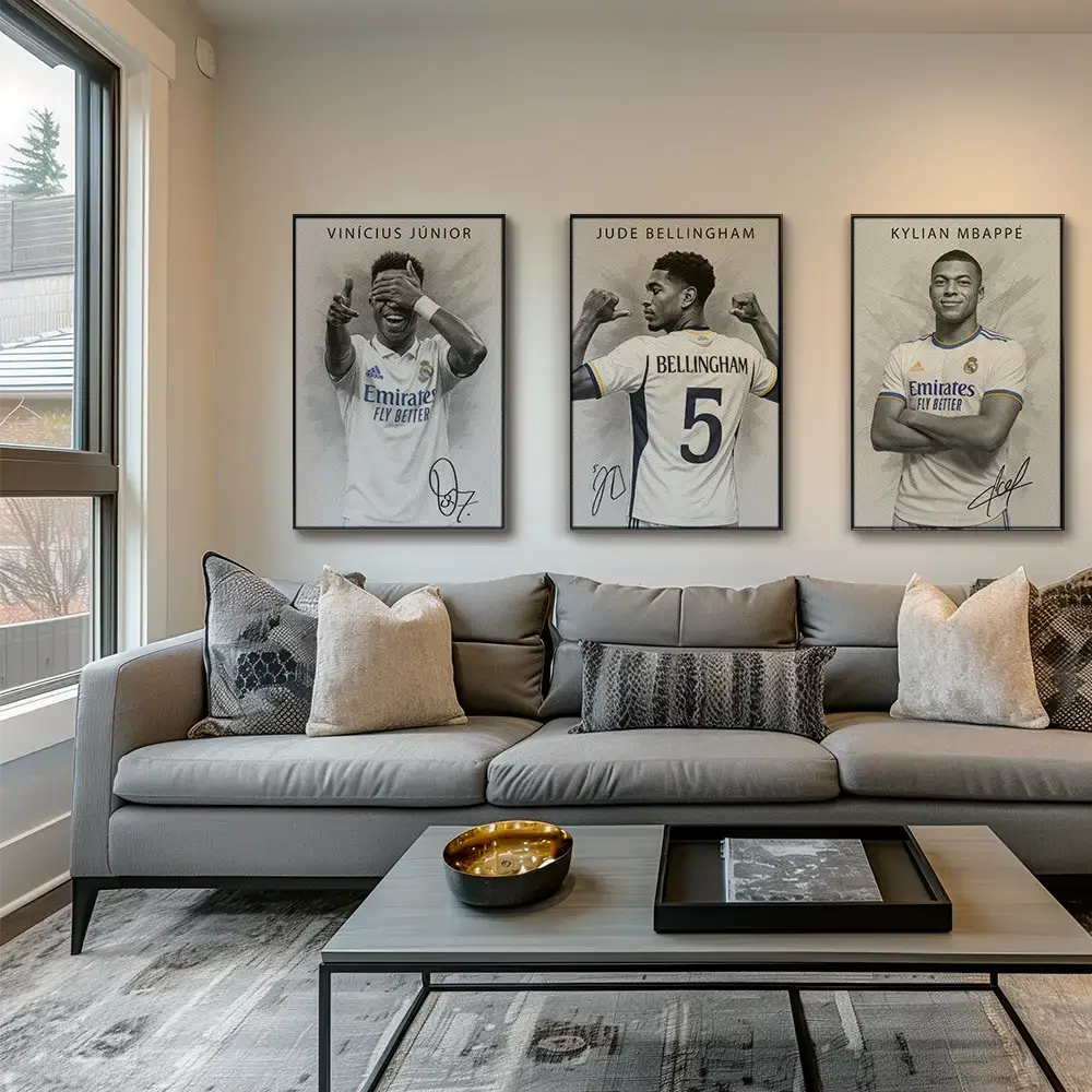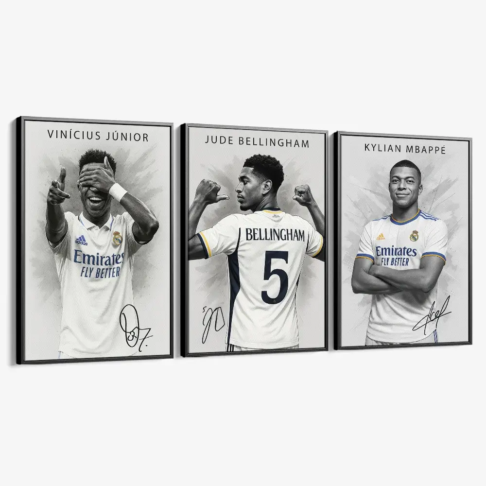 En elegant triptyk samlar tre moderna superstjärnor från Madrid i ljust vitt. Grafitstrukturer och subtila blåguldaccenter ger skjortan djup och glans. De kontrasterande poserna – lekfulla, drivna och självsäkra – sätter en livlig rytm över uppsättningen. Unik typografi och signaturer förenar allt till ett uttryck för vardagsrummet, kontoret eller spelrummet.