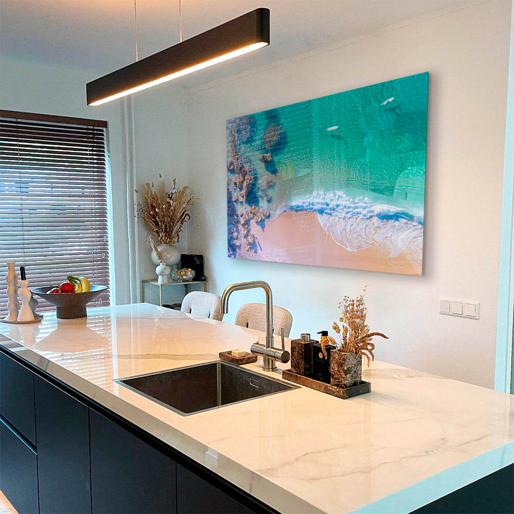 Vår glaskollektion är gjord av härdat premiumglas och är den lyxigaste samlingen av de tavlor vi erbjuder. Tack vare det klara glaset får du en väldigt fin djupeffekt. Tillsammans med glasets reflektion ger detta en vacker effekt i ditt vardagsrum, matsal eller sovrum!