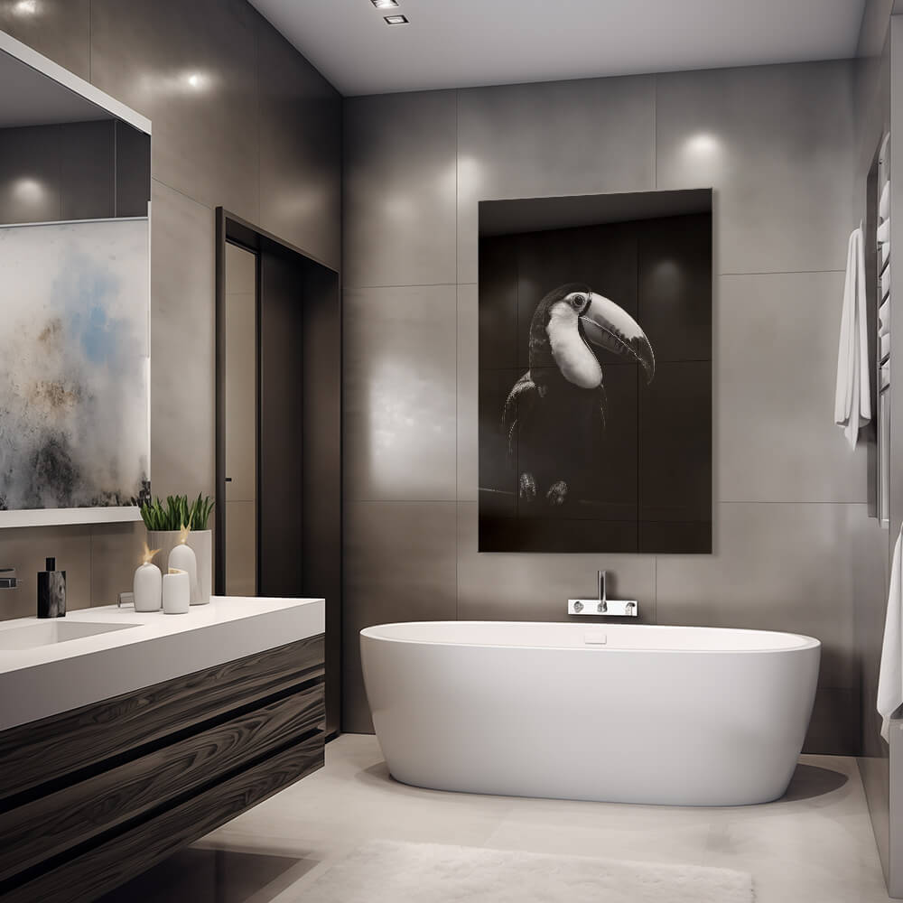 "Tropical Silhouette" väcker den klassiska skönheten hos en tukan till liv i svart och vitt. Detaljerna i dess imponerande näbb och fina fjädrar är vackert framhävda. Perfekt för älskare av eleganta och minimalistiska konstverk.